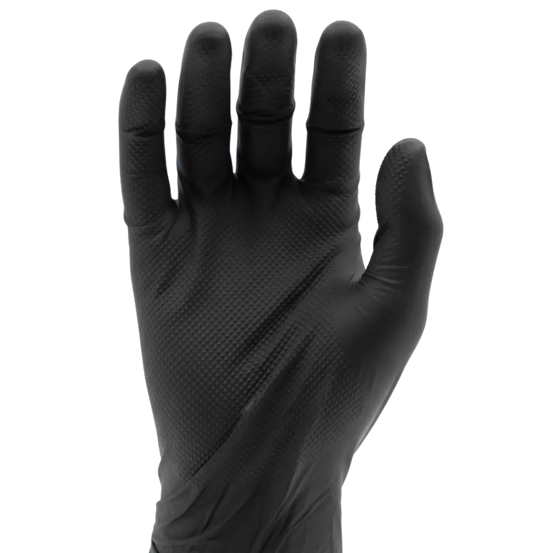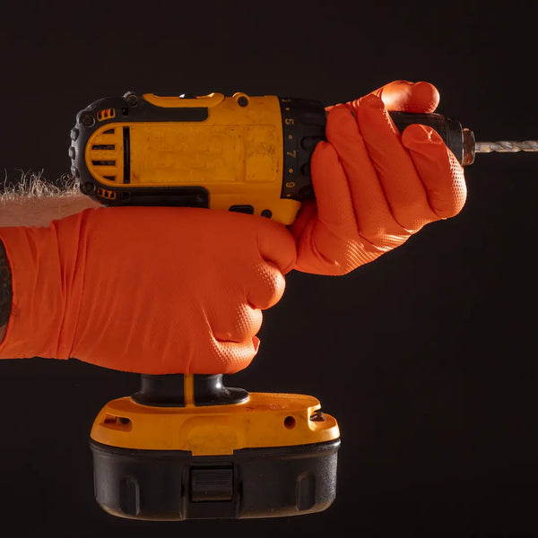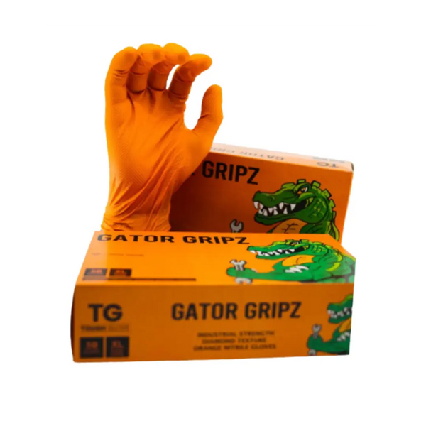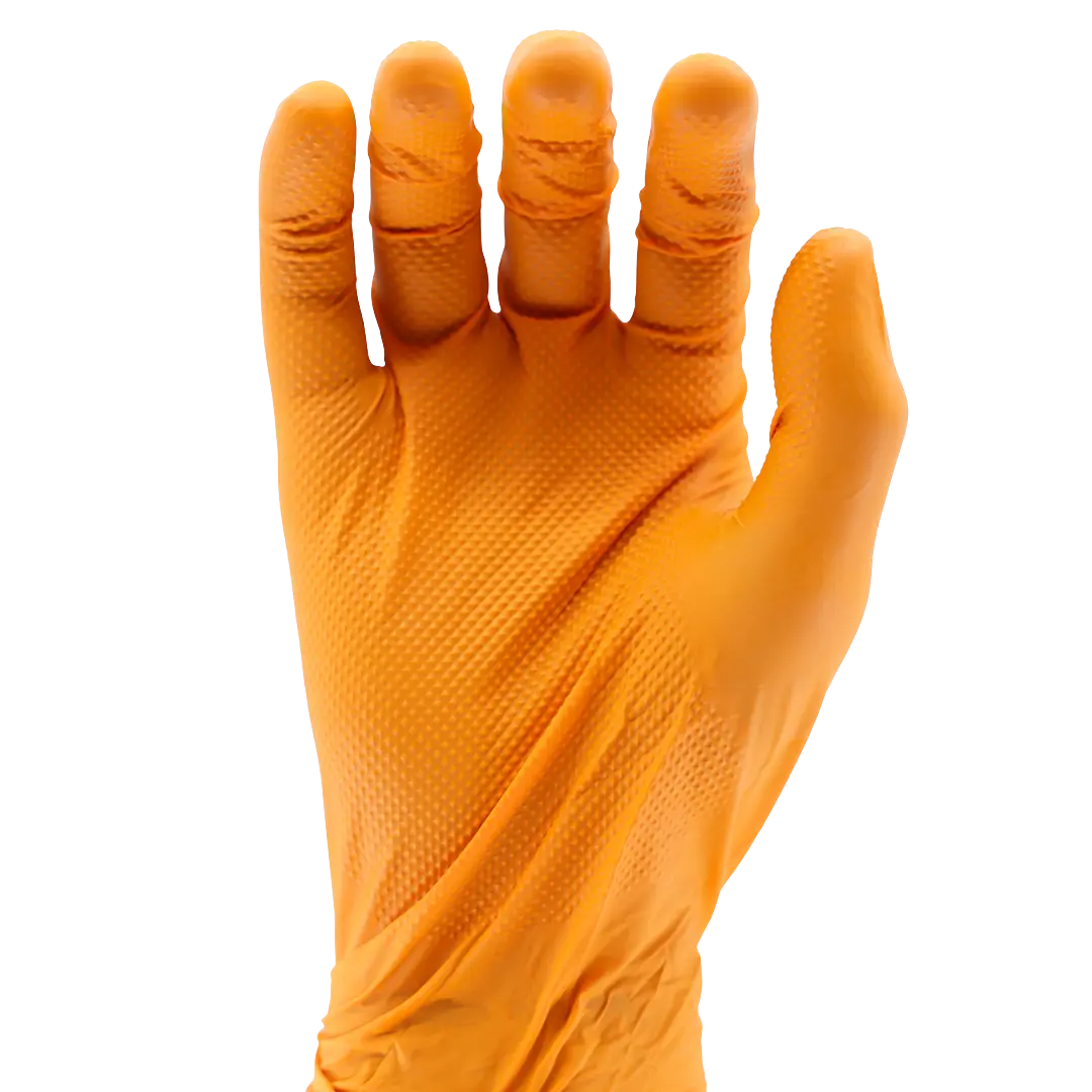 The Gator Gripz come in at a weighty 8.6g per glove and currently hold the record for the toughest glove that we make. It boasts an insane 12mil thickness at finger, 10mil at palm and 5mil at cuff making them some of the strongest orange diamond texture disposable gloves on the market all while offering Type B level chemical test approvals and a diamond grip texturing that’s been perfected with years of R&D. Lot’s of secrets go into making this our best glove but a key reason is the exclusive high quality raw materials used to create the product, by using High ACN nitrile we’ve made a glove that’s super resistant to oil and chemicals but applied our factory production expertise at a formulation and wash level so that flexibility isn’t compromised.